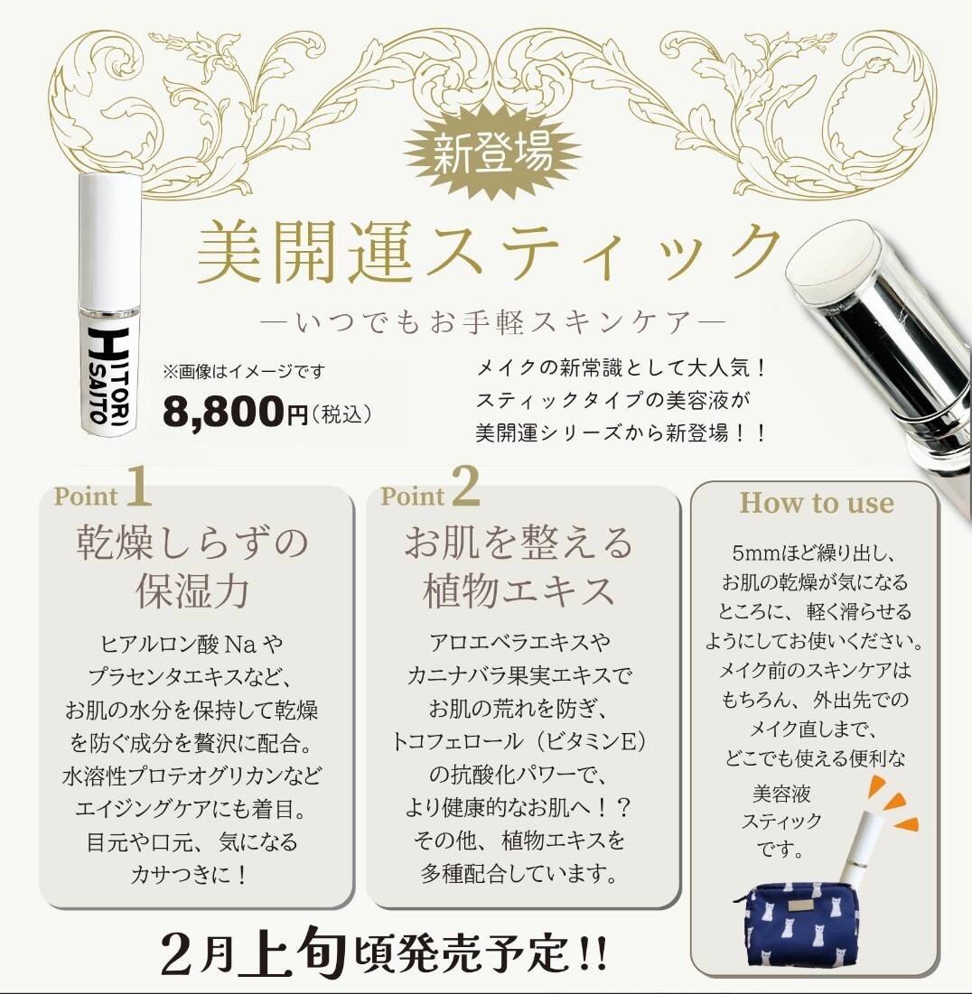 この美開運スティックには、カニナバラ果実エキス、マドンナリリ-根エキス、ヒメフウロエキス、クズ根エキス、アロエベラ葉エキス、クロレラエキス、ビタミンEなどの成分が配合されています。特にプロテオグリカンが入っており、潤いを与え、ハリや弾力をサポートします。